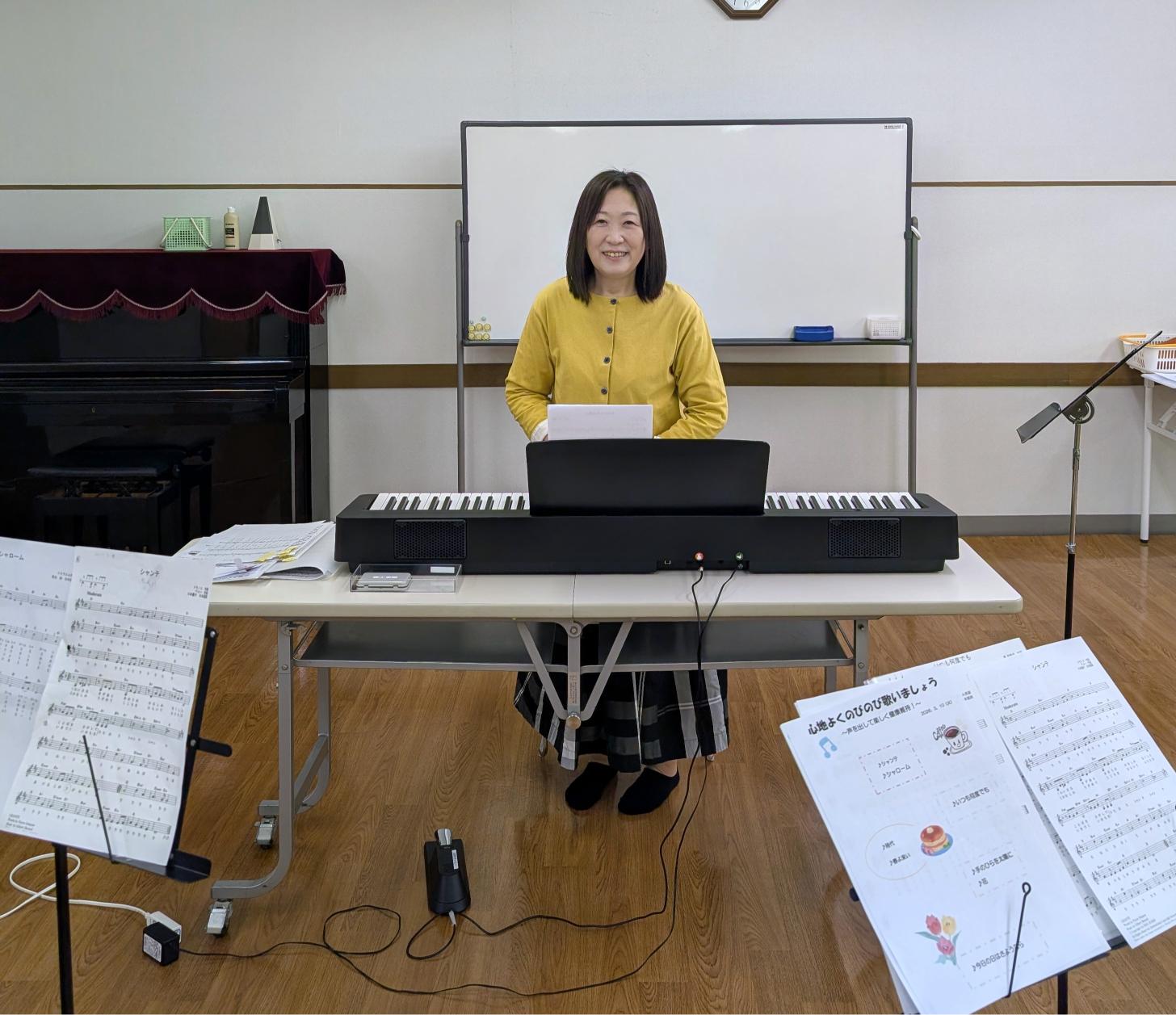 からだ全体を使って声を出します。筋肉もほぐれ気持ち良く声を出せるようになります。誰もが知っている曲をのびのびと歌いましょう。